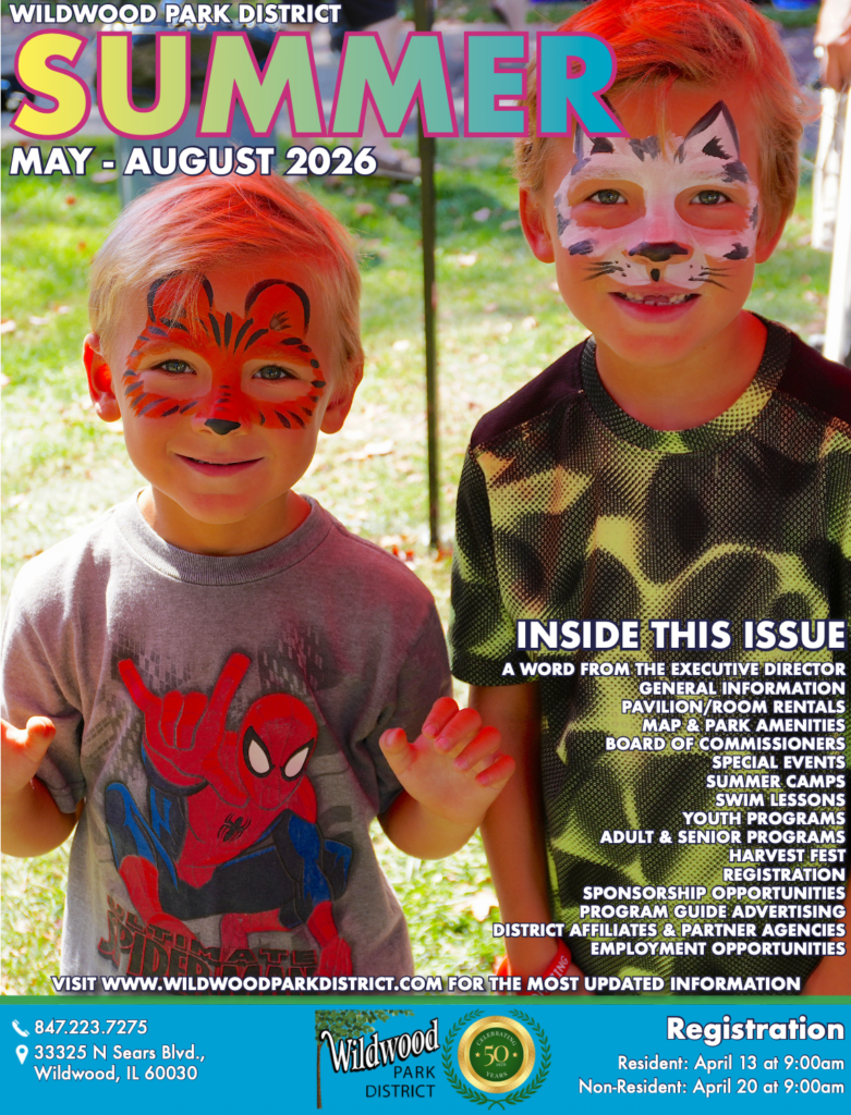 The Wildwood Park District offers businesses and organizations an opportunity to place advertisements inside our Seasonal Program Guides. We print and circulate 8,500 guides, 3 seasons per year, throughout Wildwood and surrounding Gurnee and Grayslake households and businesses. Additional copies are distributed in our facility, during special events, at local community fairs, and in local schools, libraries, and township centers. Seasonal Program Guides are also available digitally on our website and social media for download. Each guide contains information on programs, classes, special events, camps, our facility, parks, and rental spaces that provides maximum exposure for businesses to reach every household in Wildwood and the surrounding area.