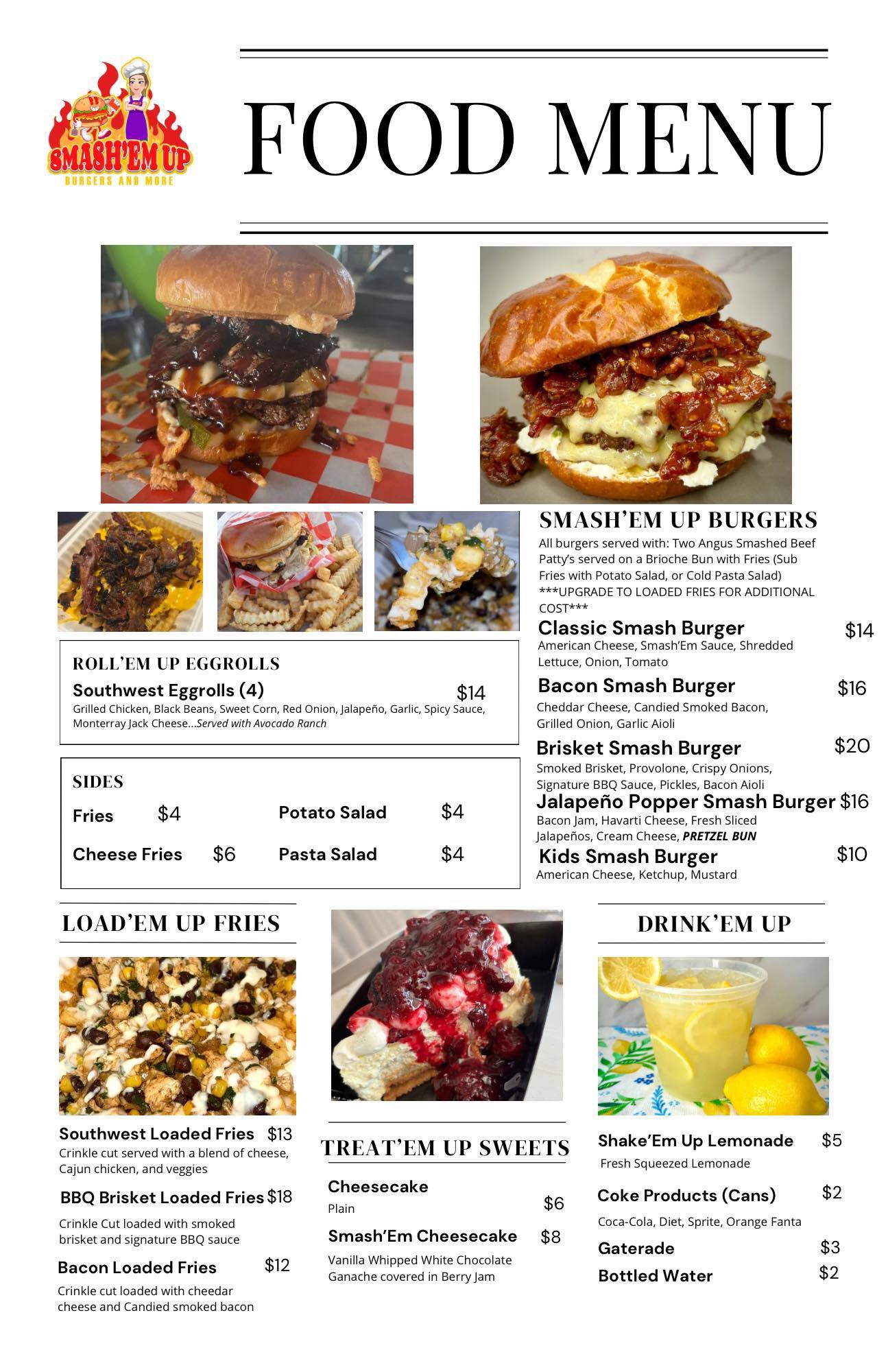 Smash’Em Up Food Truck serves delicious burgers, egg rolls, loaded fries, sides, cheesecake, fresh squeezed lemonade, and more! Click here to view the menu.